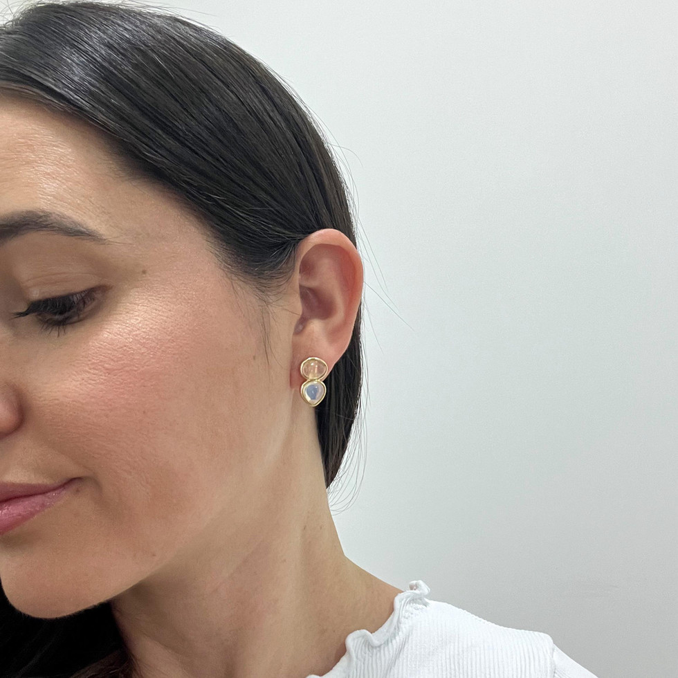 Uma semijoia delicada e sofisticada, perfeita para quem busca elegância com um toque suave e luminoso. O brinco duplo apresenta uma composição harmoniosa com quartzo rosa e opalina em formatos orgânicos, unindo o tom rosado suave à translucidez leitosa da opalina. O resultado é uma peça leve, feminina e versátil, ideal para valorizar o visual com charme e sutileza.