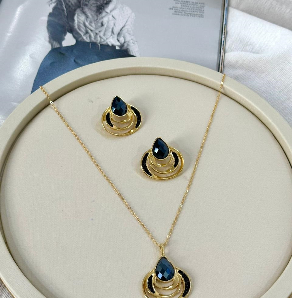 Sofisticado e marcante, este conjunto dourado combina a intensidade da ágata preta facetada com a profundidade dos detalhes em turmalina negra. As facetas da pedra refletem a luz de forma elegante, criando um brilho sutil que valoriza ainda mais o design da peça.